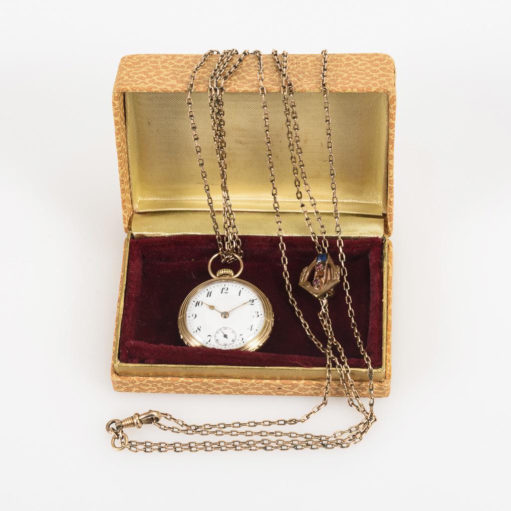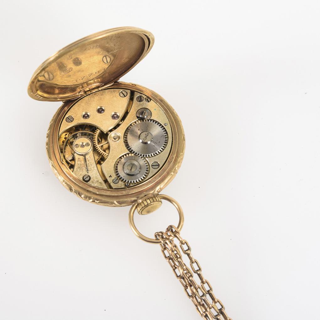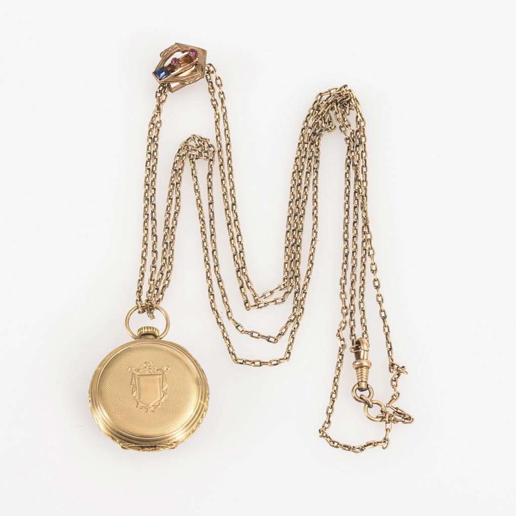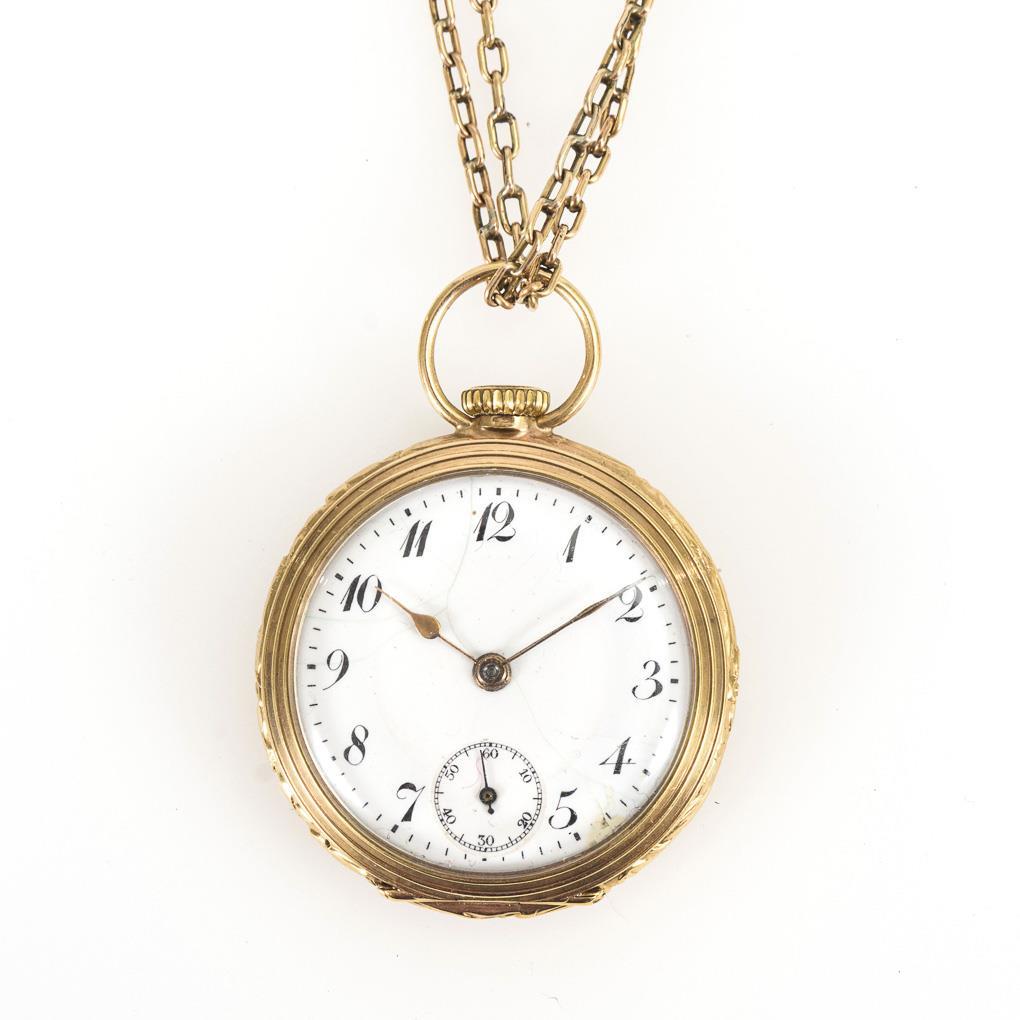 Open case with guilloché back cover and empty crest reserve. On metal link chain with slider and lobster clasp, L 72.5 cm. Dial hairline cracked, probably supplemented crown.