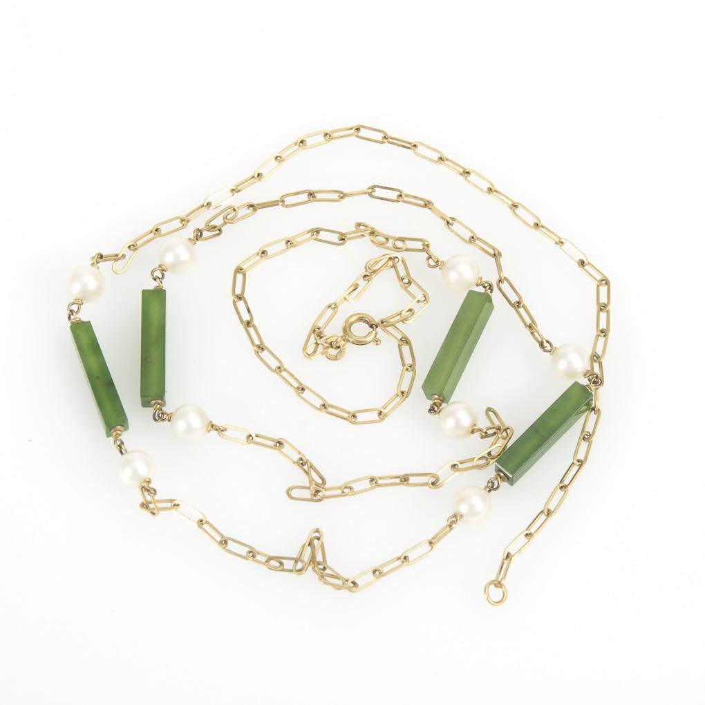 Cultured pearls and jade rods between anchor chain with ring spring clasp.