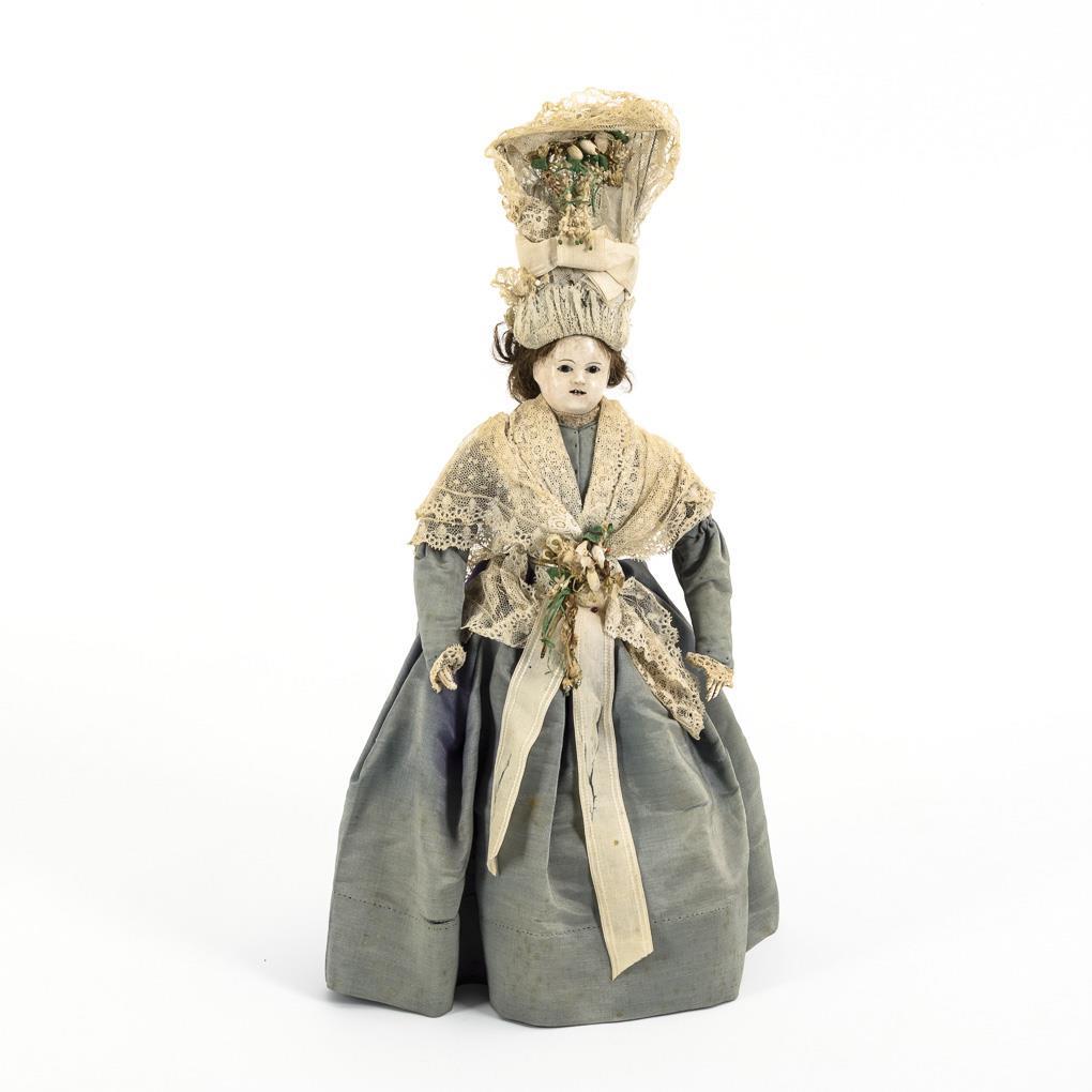In the style of a Pauline. Painted mass full head with black painted hair, dark pupil-less glass eyes, open mouth with bamboo teeth. Original real hair bead. Stiff, light pink leather body with raised fingers. Original clothing of blue-grey silk with fine lace, very high bonnet, original undergarments, stockings and shoes. Good condition, at the back of the head 4 holes (nail marks?), slight signs of age on the silk dress (doll can not be undressed).