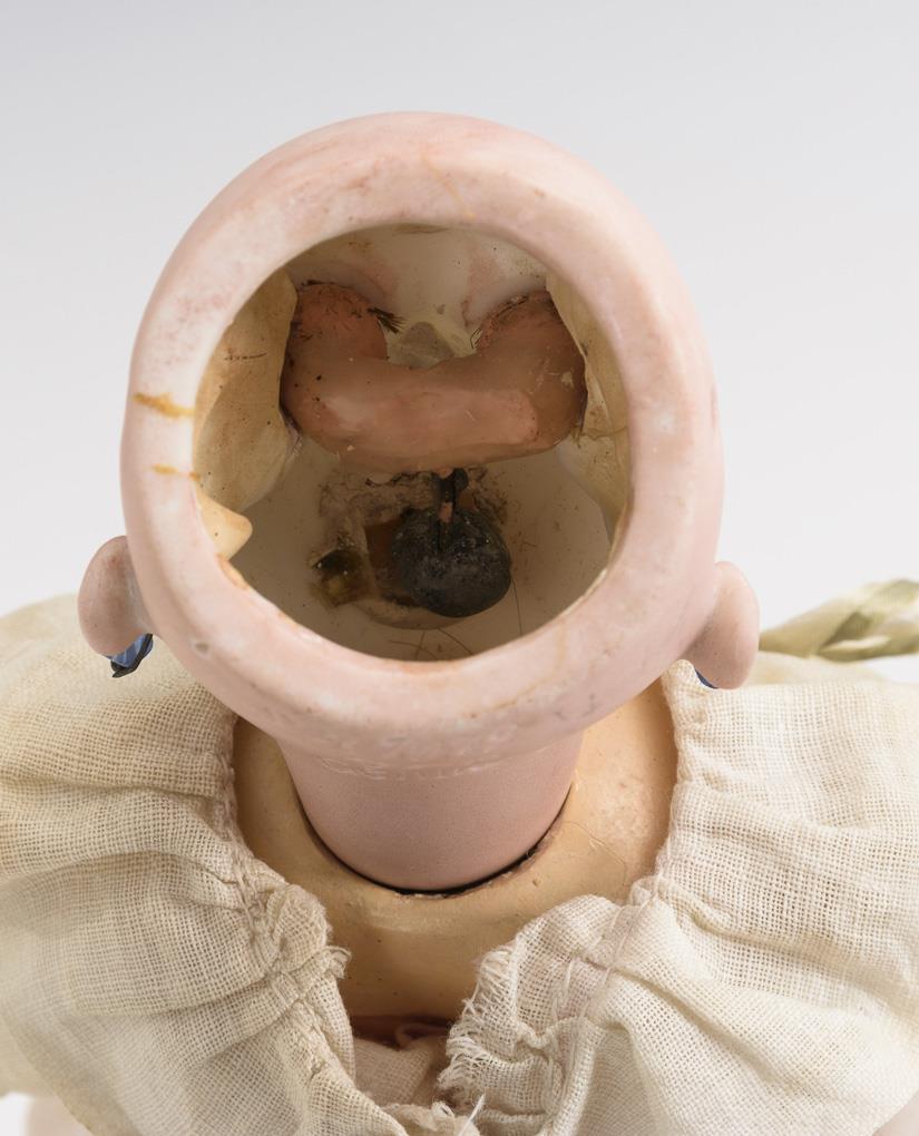 Crank head, blue sleeping eyes with human hair eyelashes, open mouth with little teeth, probably original human hair wig, earrings. 17-piece jointed body. Old little dress, straw hat, underwear, shoes and socks. Head x-rayed: without defects, only minimal production defect at the crown of the head.