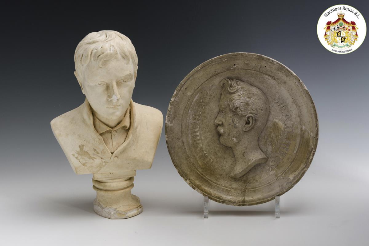 Portrait bust of a young man. / Round portrait plaque with legend "Heinrich XX. S.F.AE.L.Reuss" (Prince Reuss zu Greiz 1794 - 1859). Partly stronger chipping, soiled.
