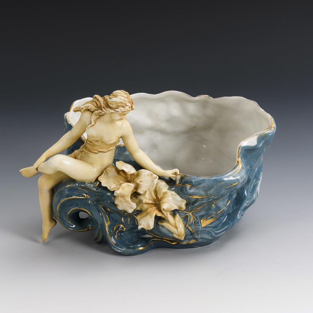 Sitting at an irregularly shaped bowl of waves female nude. Right leg of the woman restored, minimal gold wear.