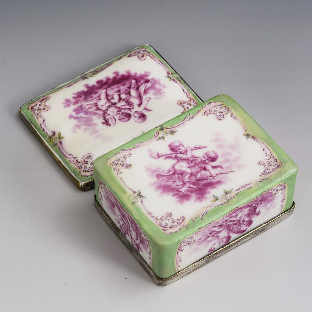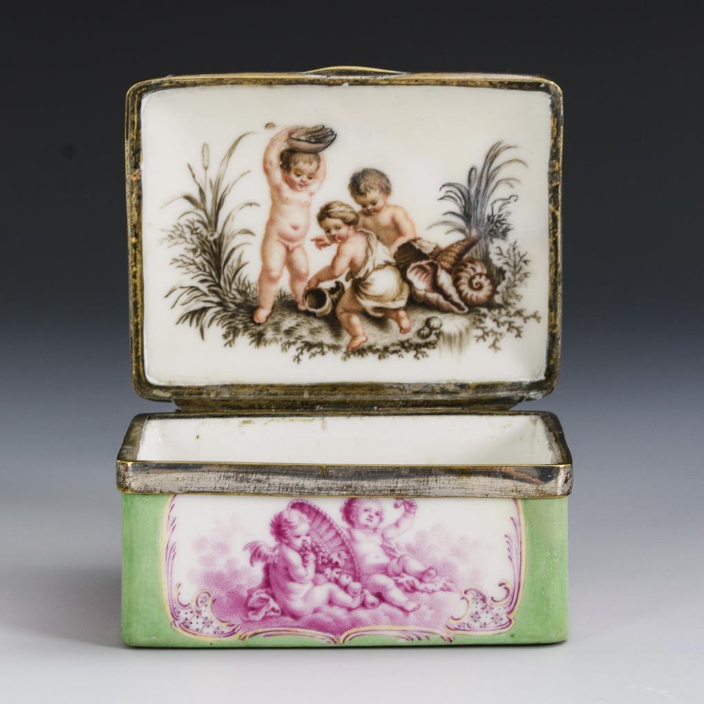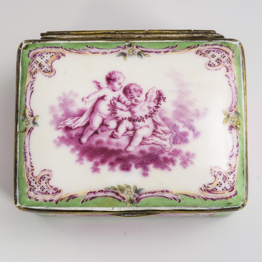 Rectangular box with metal mounted hinged lid. Green ground with rocaillerelief-framed cartouches, within purple-painted pairs of putti floating on clouds, the lid depicting three putti with shells among reed grass. 1 Body corner and lid restored.