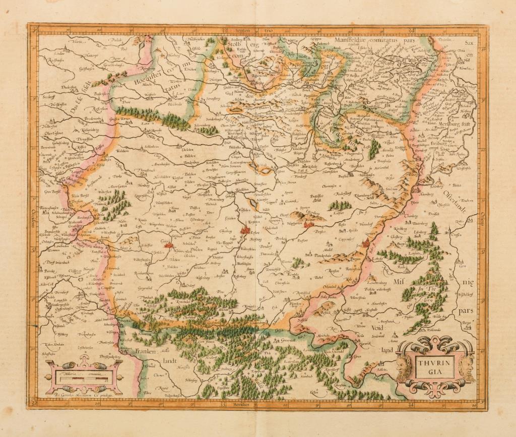 Detaillierte Karte der Landgrafschaft Thüringen, bezeichnet "Thvringia", verso Erklärung in französischer Sprache; aus dem Mercator-Hondius-Atlas (um 1609). Hinterklebte Bugfalte, stockfleckig.