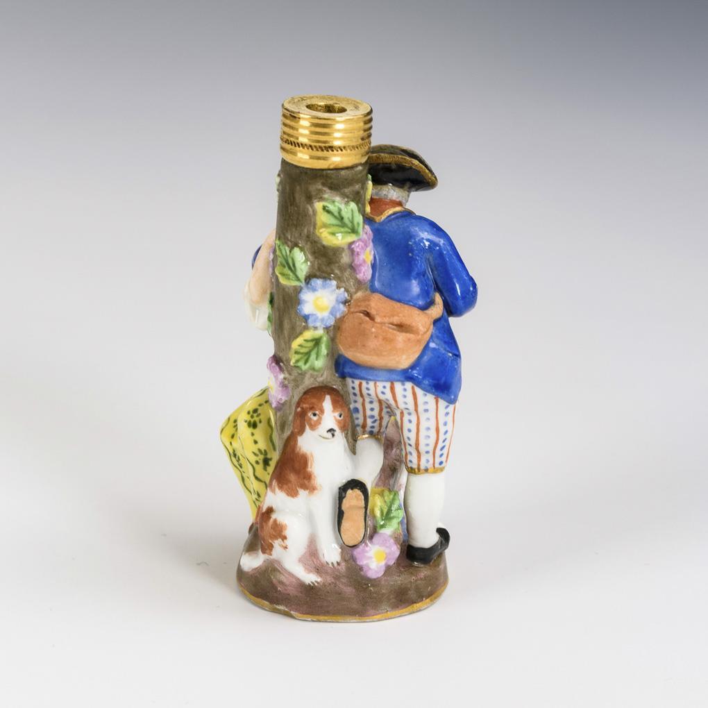 On a flower-covered column as flacon kissing shepherd couple with lamb and dog. Without lid. 1 hat bumped, both hats restored.
