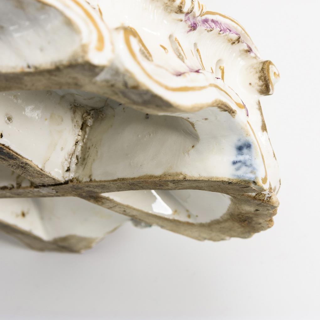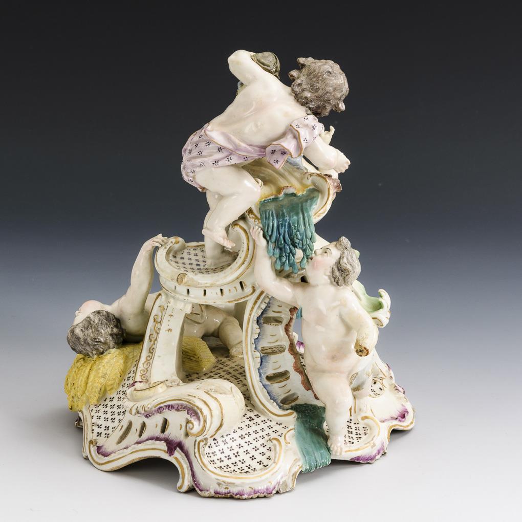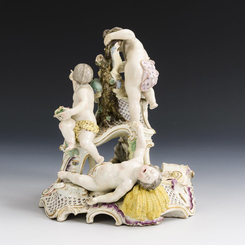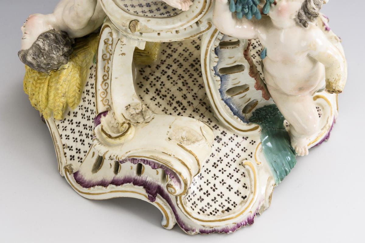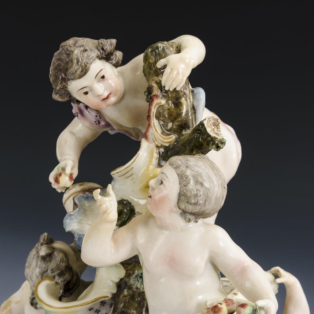 Rocailles base, on it arranged 4 putti with apple basket and sheaf. 1 figure and 1 hand missing, with bumps, 1 branch stump and 2 fingers restored.