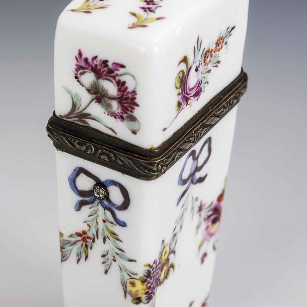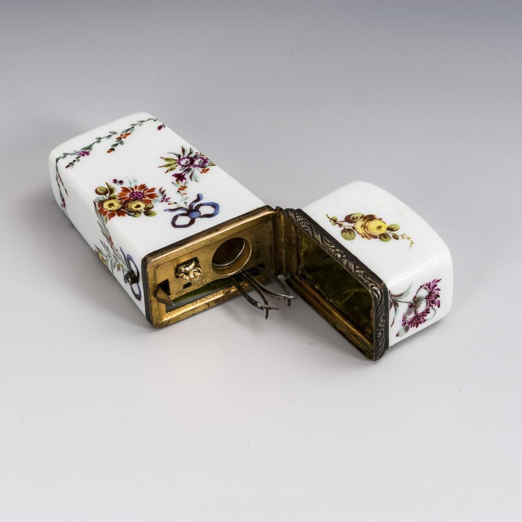Conical rectangular case with silver mounted hinged lid (indistinctly hallmarked, inspected) and polychrome floral and bow painting. With scissors, needle case and thimble.