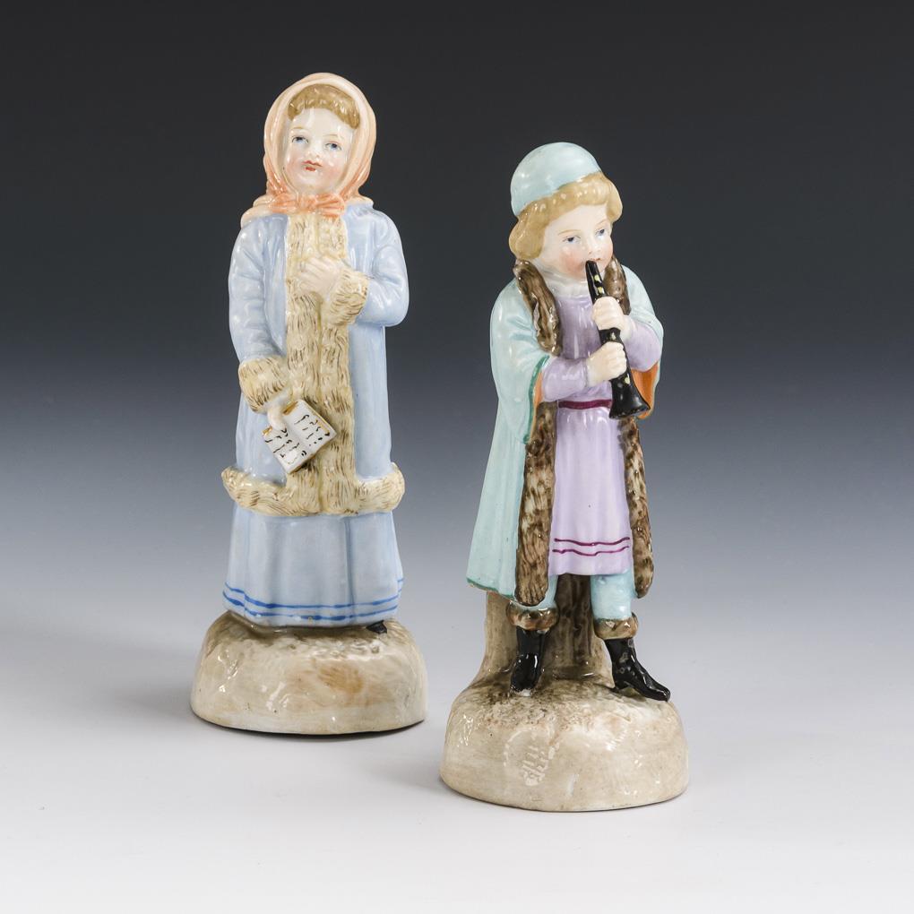 2 children in Russian dress: the boy playing a shawm, the girl holding a songbook. Right shoe tip of the boy bumped.