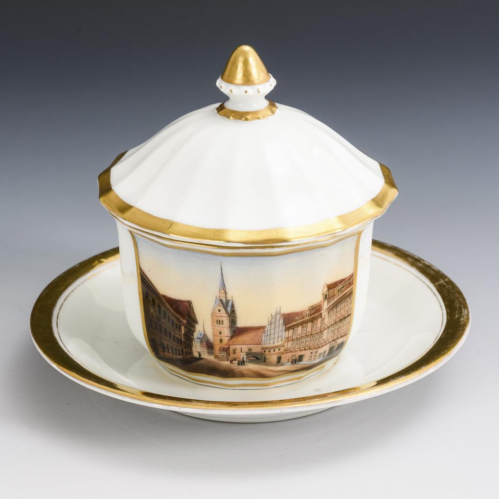 Polygonal cup with knobbed lid. On the front a gold-framed rectangular cartouche with the view of the market church and bathhouse in Hannover inscribed on the underside. 2 hairline cracks and 1 restoration on the rim of the cup, restoration on the lid.