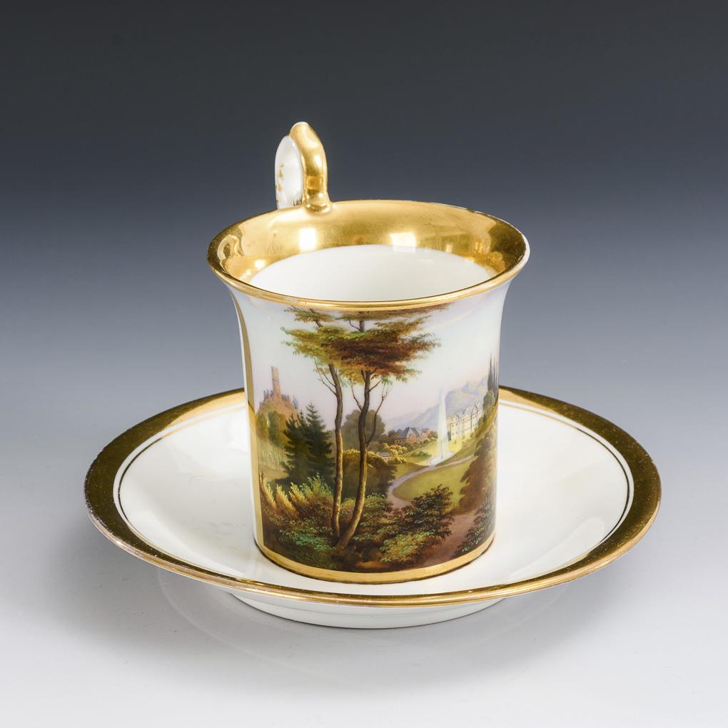 Polychrome painted, gold decorated. H cup 11 cm, Ø supplemented saucer 16,5 cm.