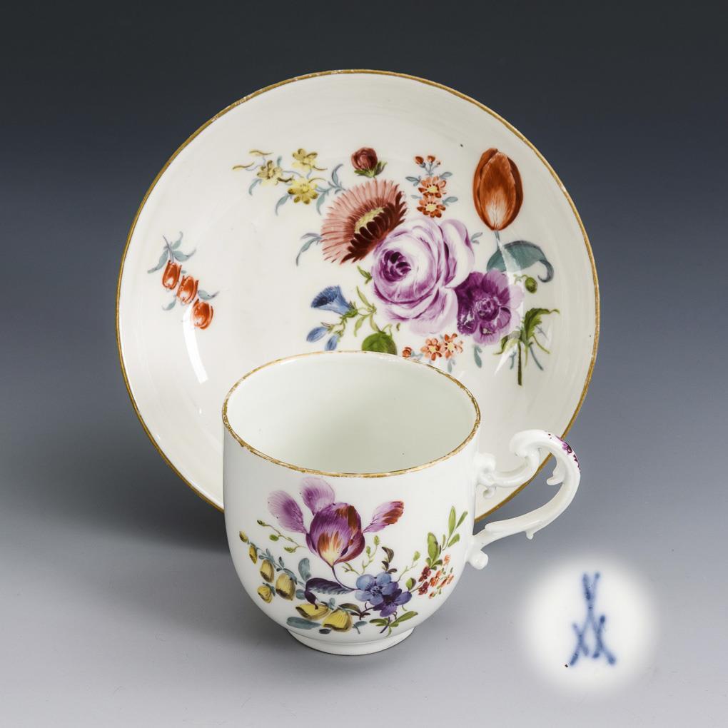 Polychrome painted, gold decorated. H cup 7 cm, Ø original saucer 14 cm.
