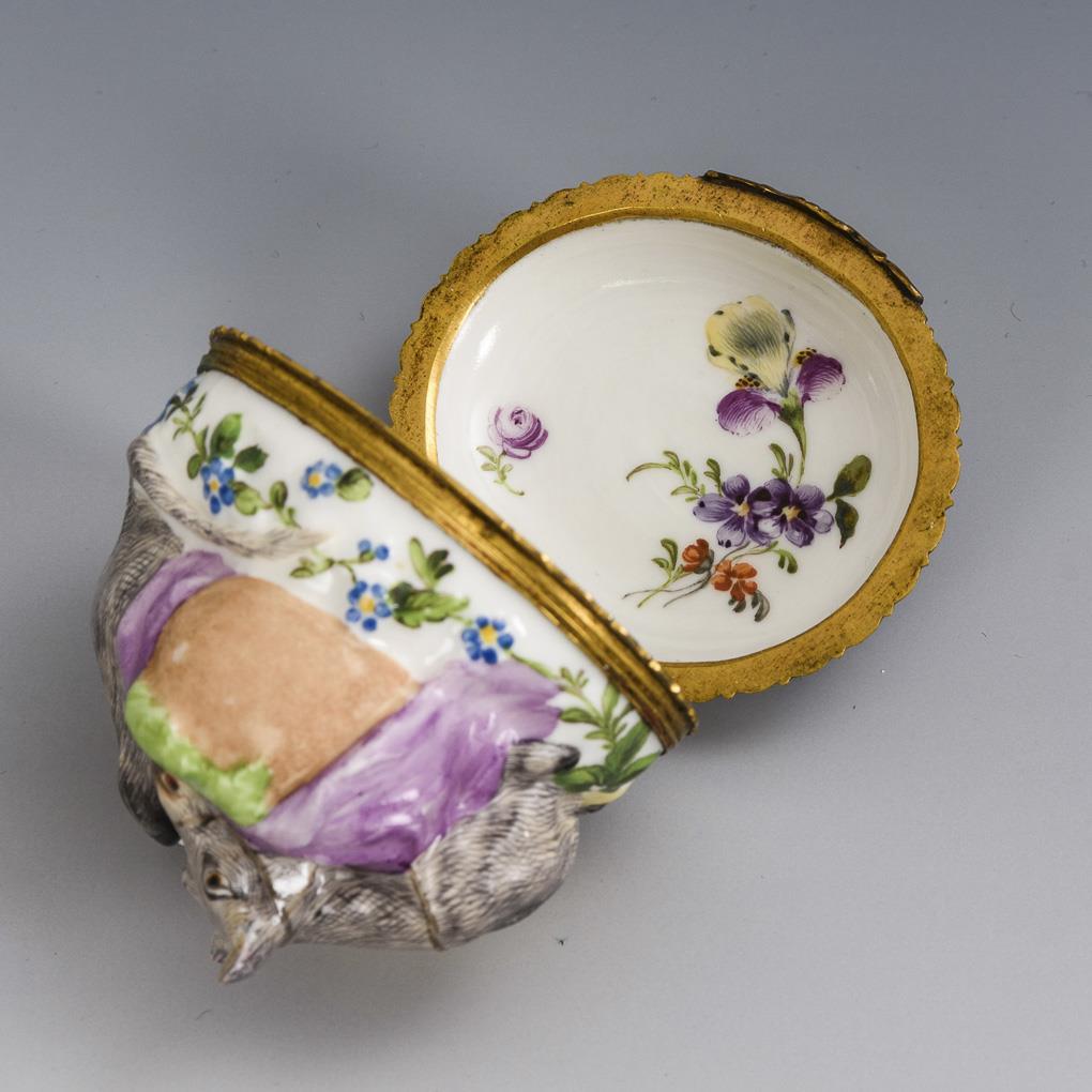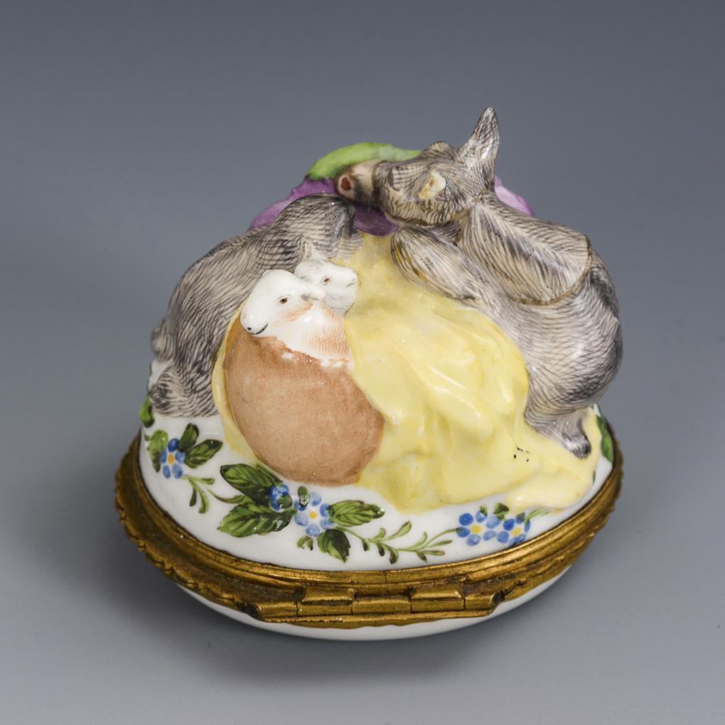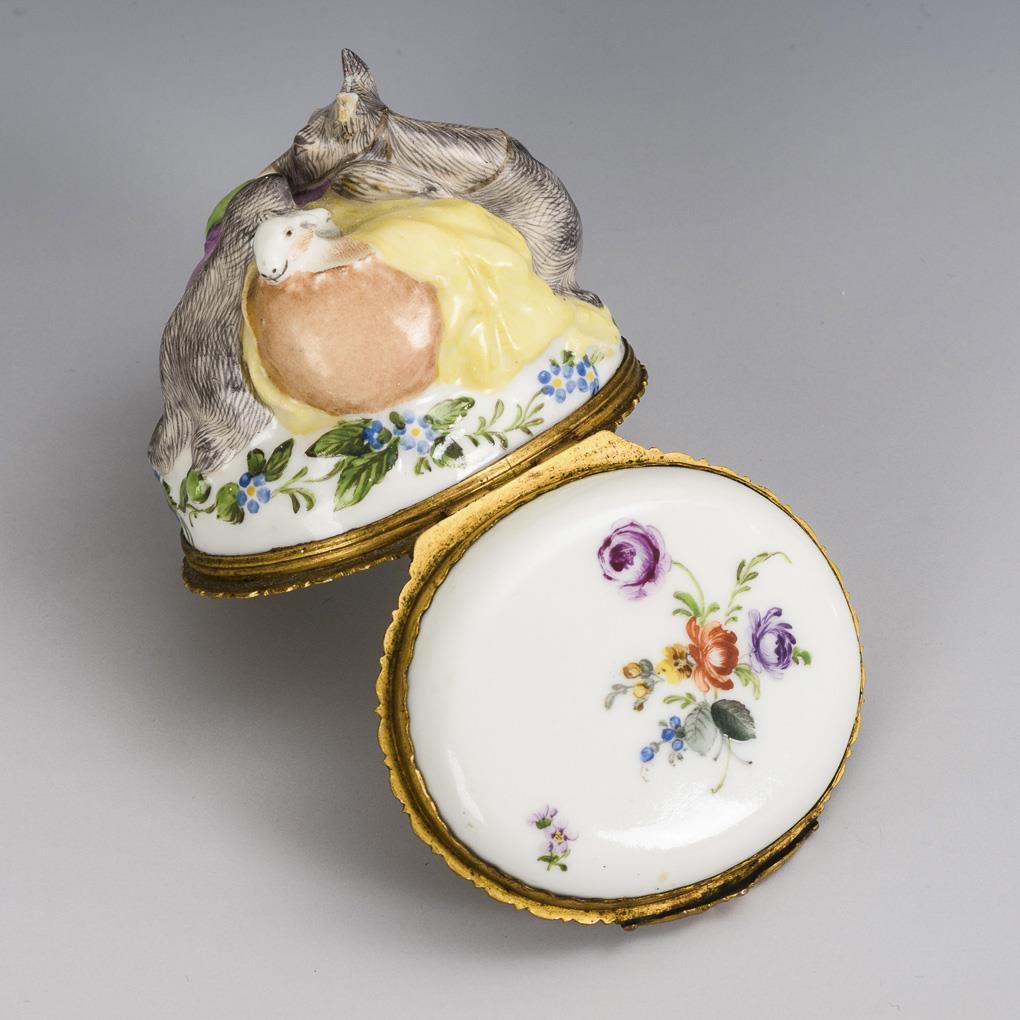 Body designed in the form of a recumbent camel laden with greens and lambs, metal mounted lid with floral painting. Both camel ears restored, 1 ear bumped.