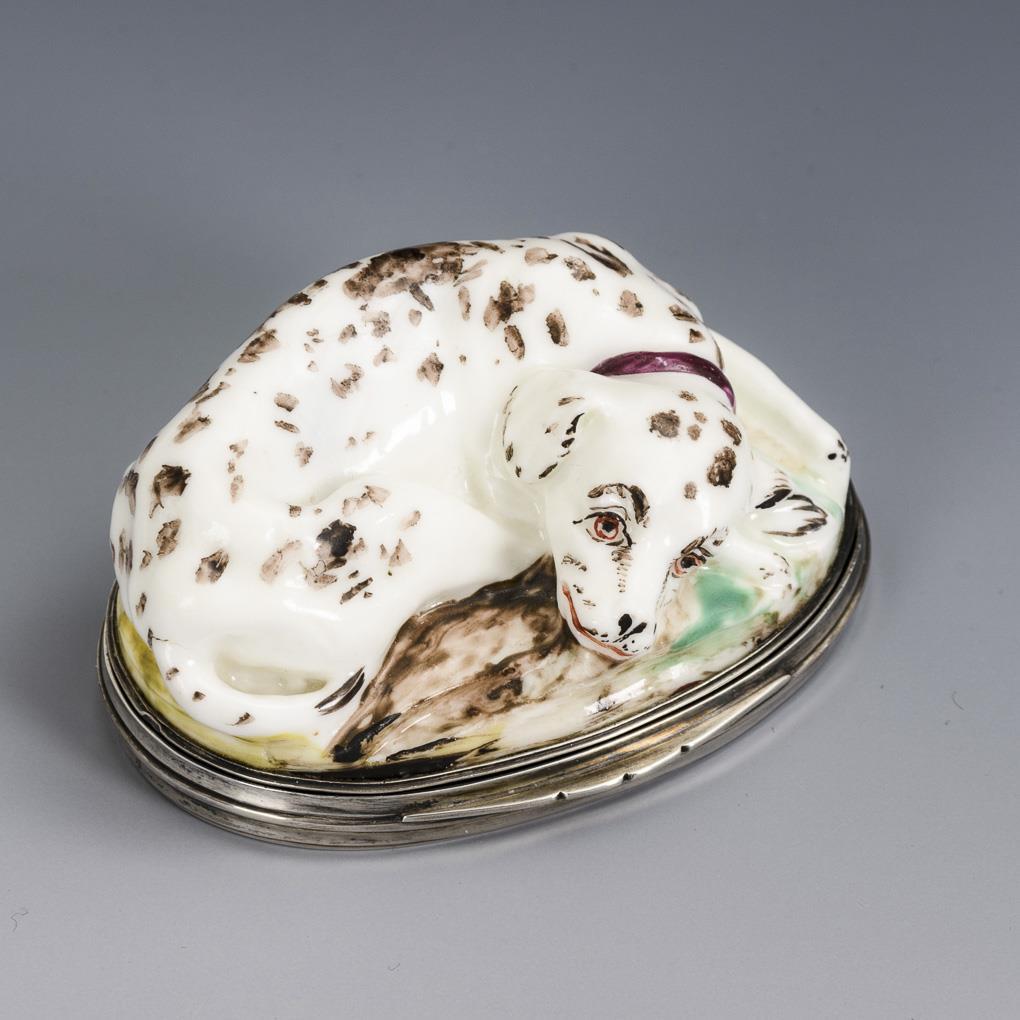 Figural tabatiere with lying dog.