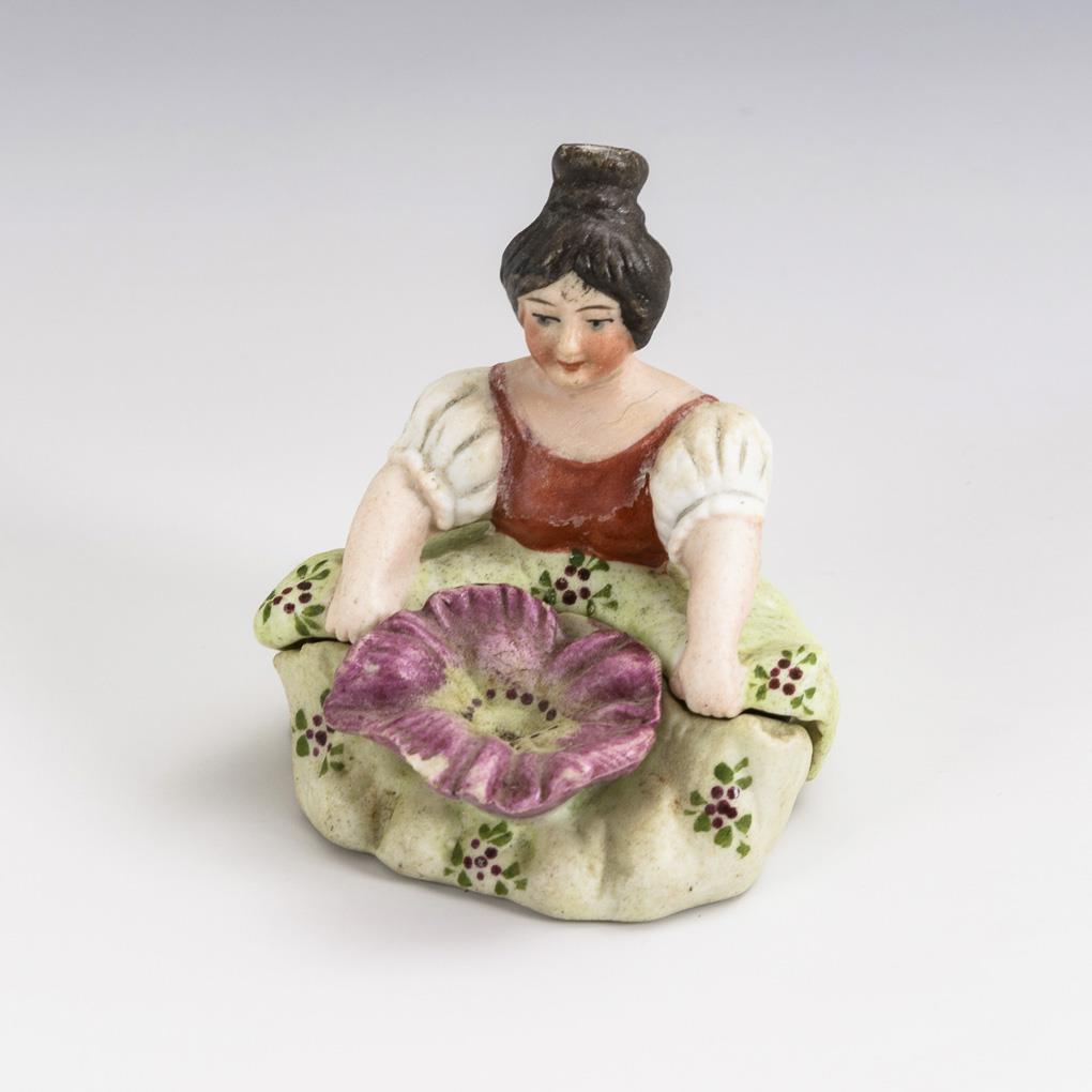 Squatting in front of a large blossom, woman gathering her skirt. Neck restored, bump to 1 petal.