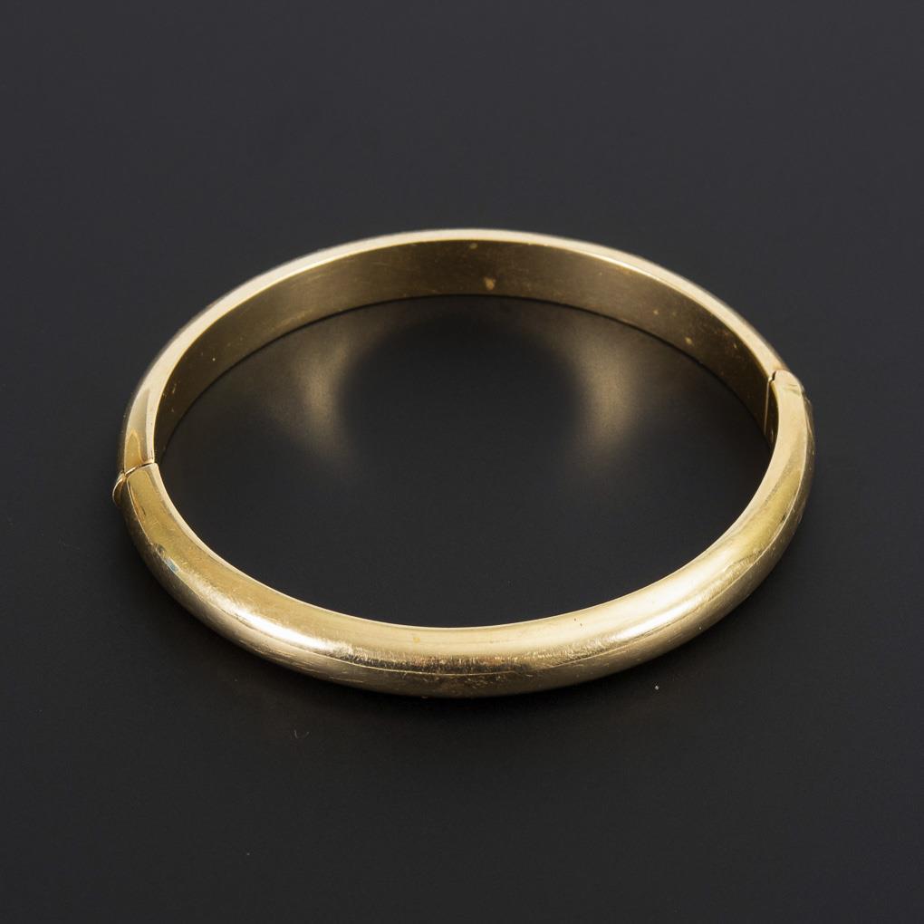Tested yellow gold 585. Hallmark indistinct. Ø 6 cm. Width 0.8 cm. 23,4 g.
