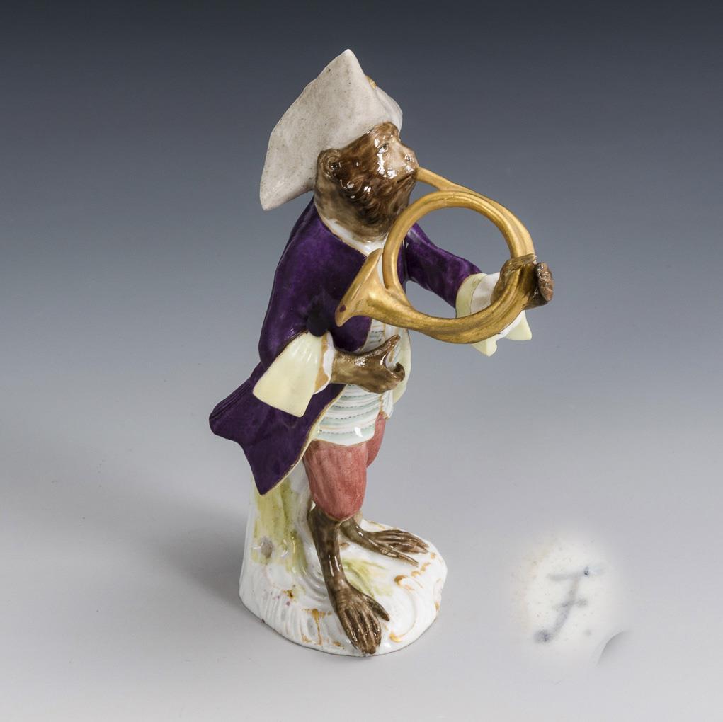 Monkey musician with French horn, after a model from 1753 by Johann Joachim Kaendler (1706 Dresden - 1775 Meissen) for the porcelain manufactory Meissen. Restoration at the frock coat and right arm, left hand restored.