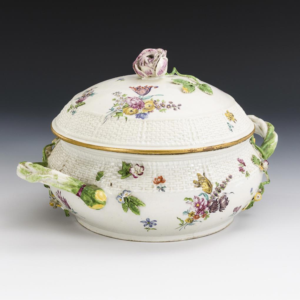 Tureen with alto decor relief, two foliate handles with floral decoration and rose finial lid. Rose finial restored, bumping to decoration.