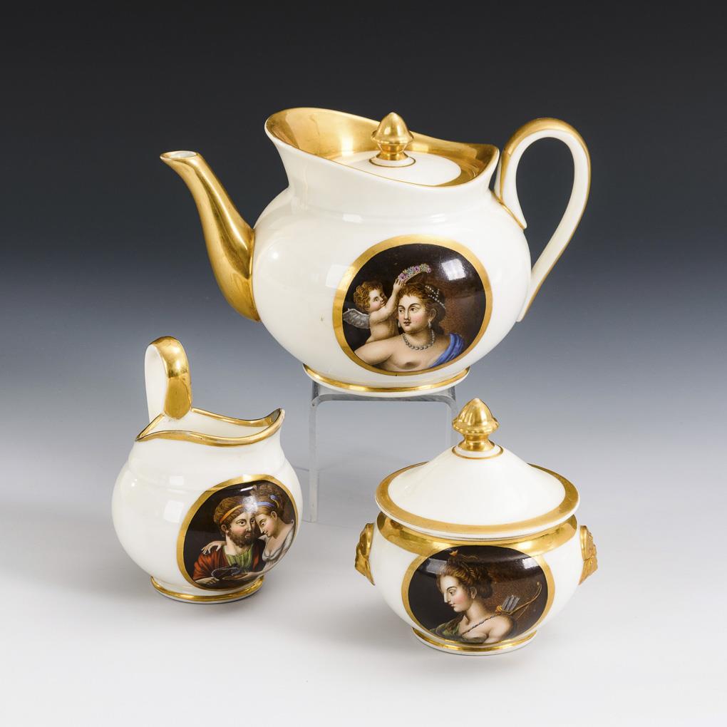 Teapot (h 12 cm), milk jug (h 10 cm) and sugar bowl (h 10 cm) with mythological motifs in gold-framed medallions. Bump on the inner rim of the sugar bowl lid.