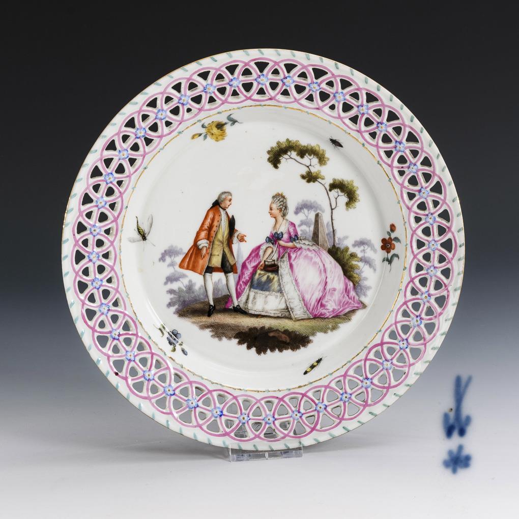 Plate with openwork flag. In the mirror the depiction of a gallant couple in a park landscape.