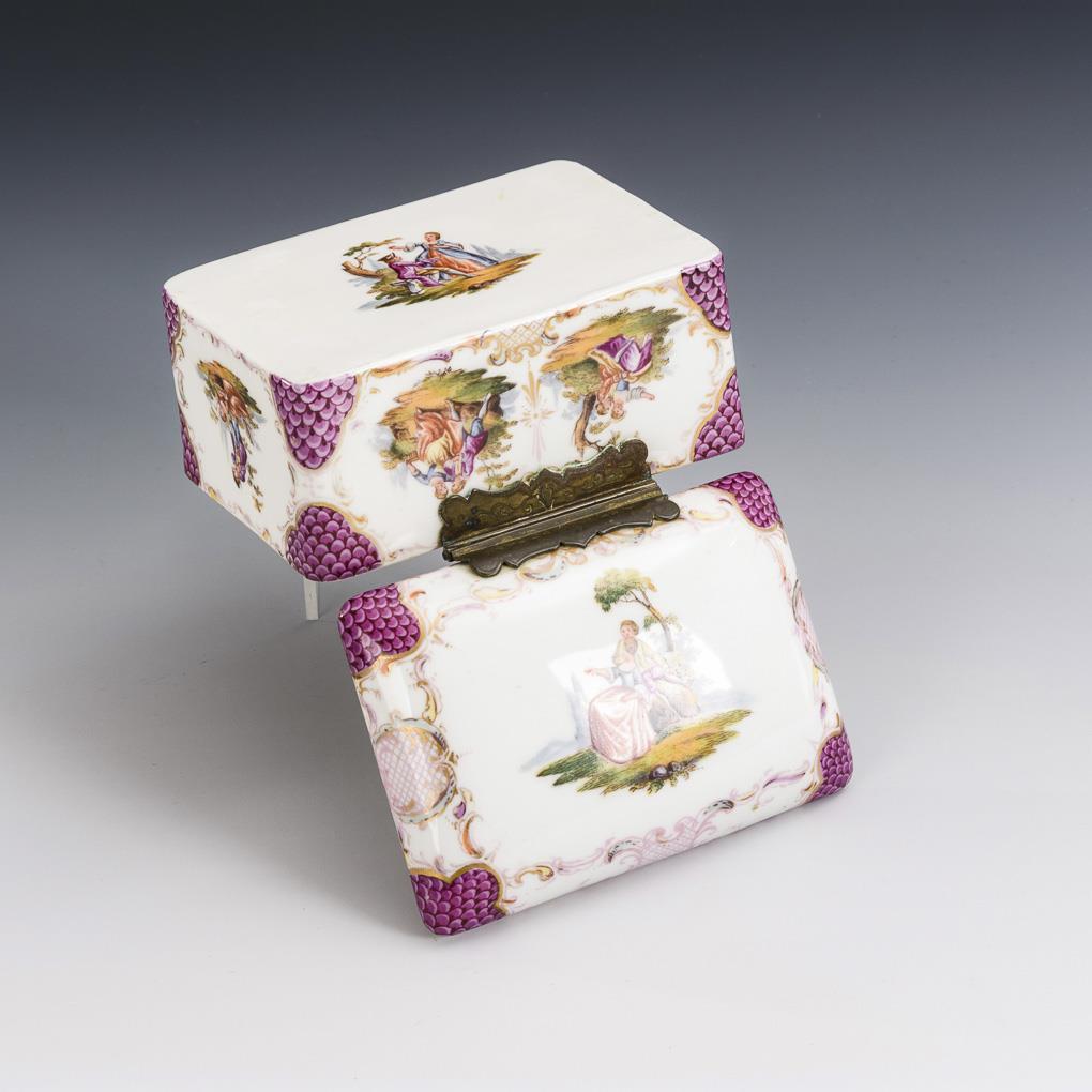 Rectangular box with hinged lid. In the corners spandrels with purple scaly background, on all sides gallant scenes.