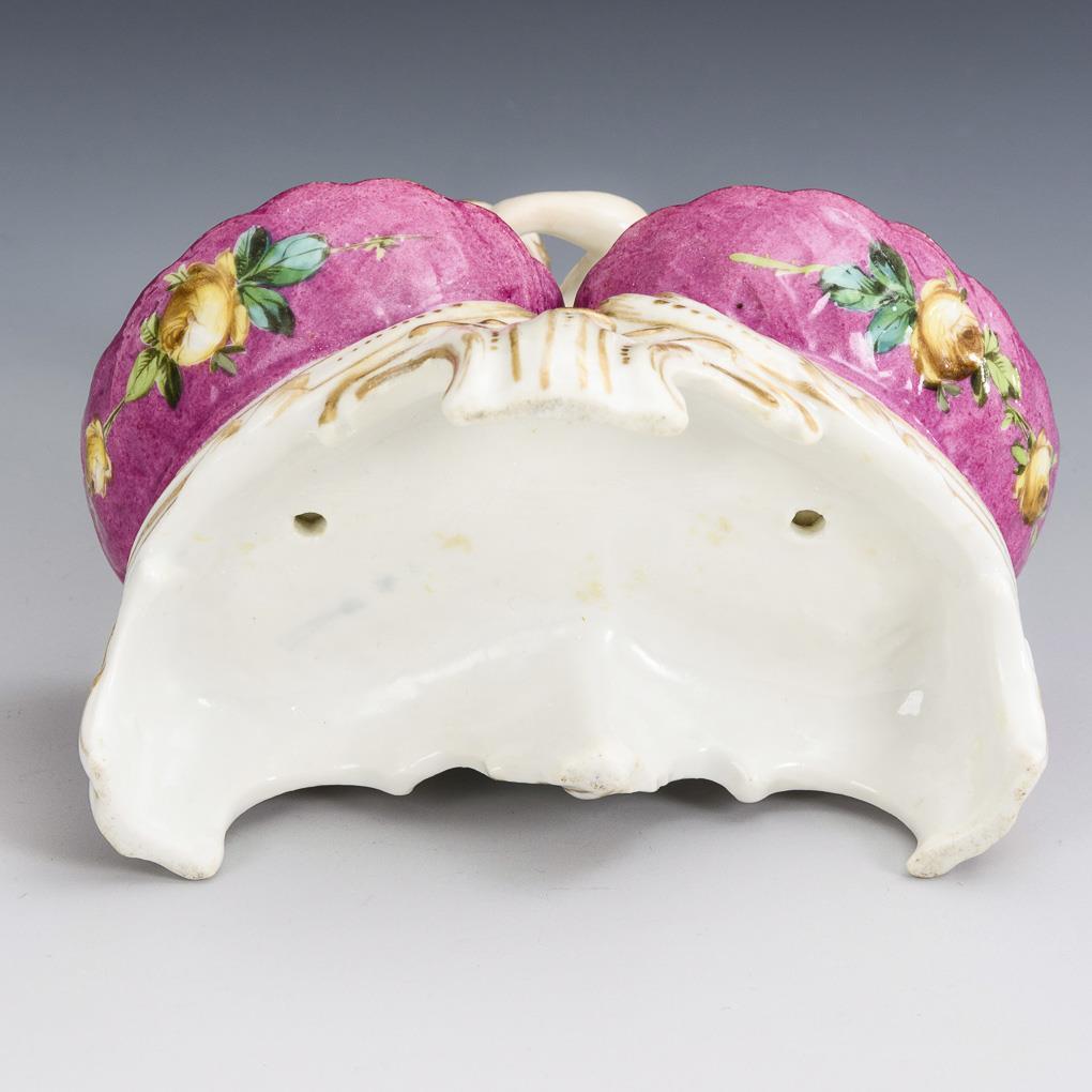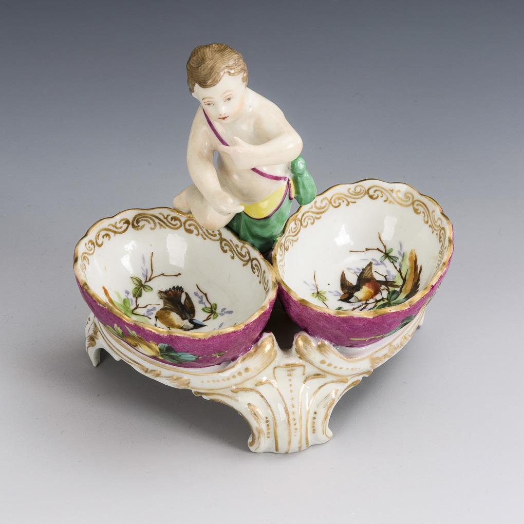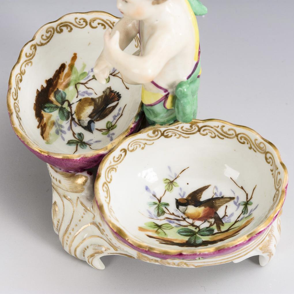 Putto standing between two salt bowls, licking his finger, on rocaille base. 1 bowl, base restored on underside and 2 fingers of left hand.