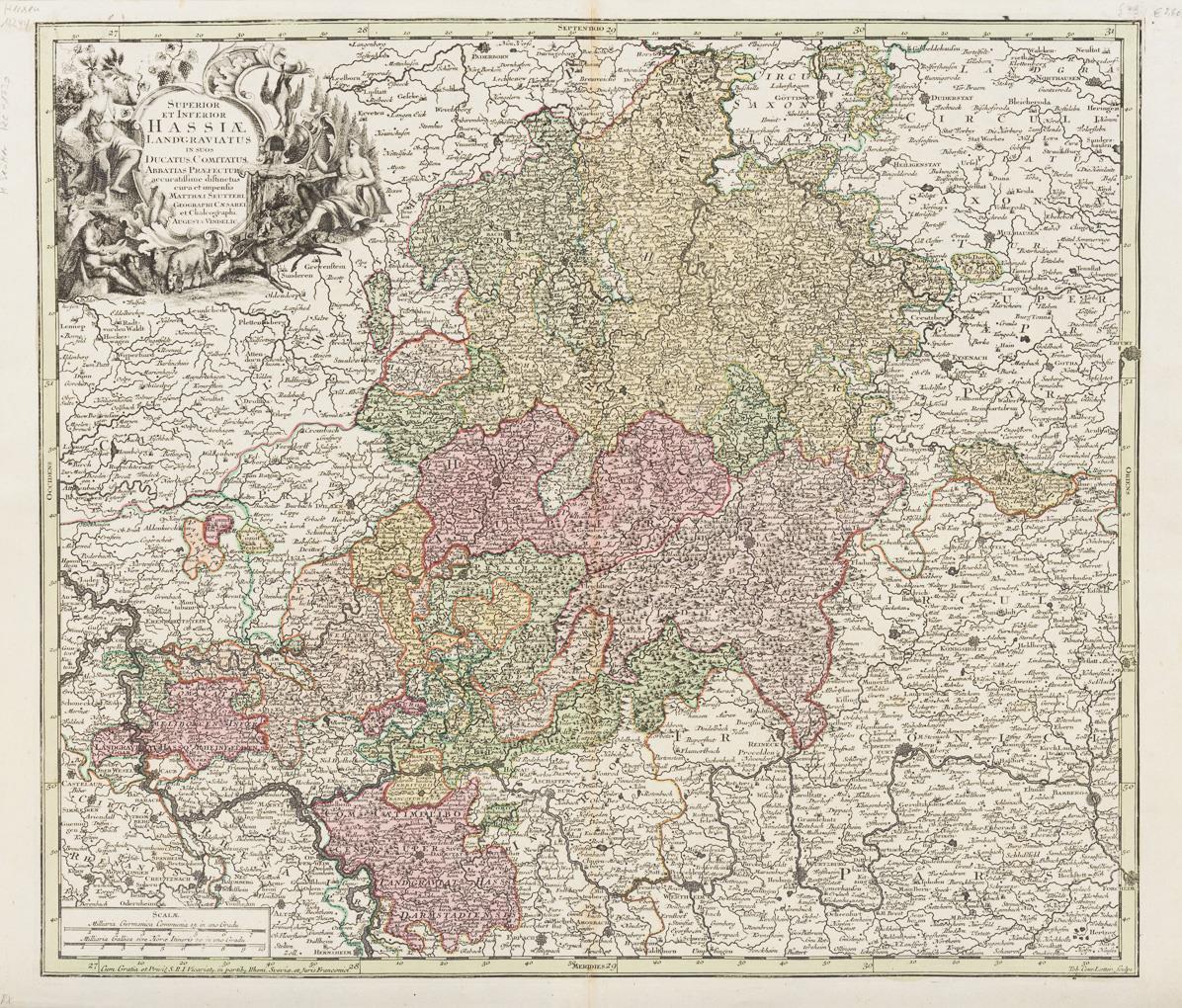 Detailed map of the provinces of Upper Hesse and Lower Hesse of the Landgraviate Hesse-Darmstadt, with figural title-cartouche, inscribed "Superior et inferior Hassiae Landgraviatus in suos Ducatus Comitatus [...]". Bow crease with glue residues verso, somewhat grip-marked.