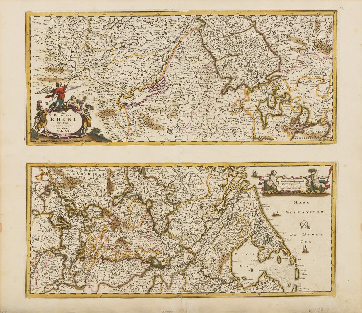 Depiction of the course of the Rhine from its origin to its mouth in two parts on one sheet, each with figural cartouche, inscribed "Totius Fluminis Rheni novissima descriptio". Buckling, border coloring partly with ink pitting, traces of handling.