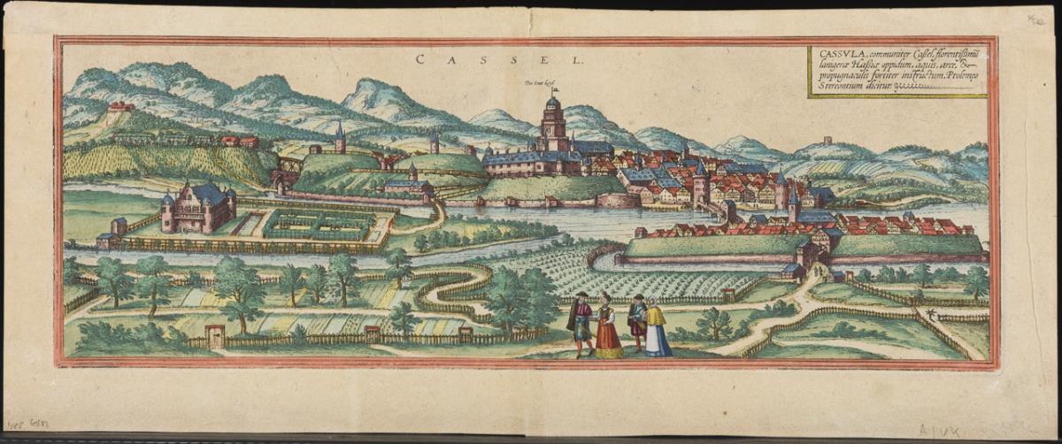 Decorative central perspective depiction of the city of Kassel, inscribed "Cassel", with title cartouche, description in Latin on verso; from "Civitates Orbis Terrarum", 1572 - 1618. Buckling, trimmed and upper margin pasted behind, traces of handling, some foxing.