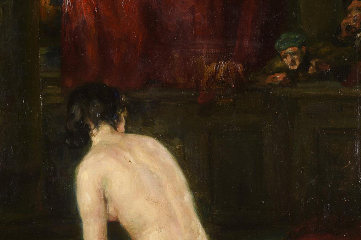 Nude woman at the bathing pool dressing while two men watch in the background.