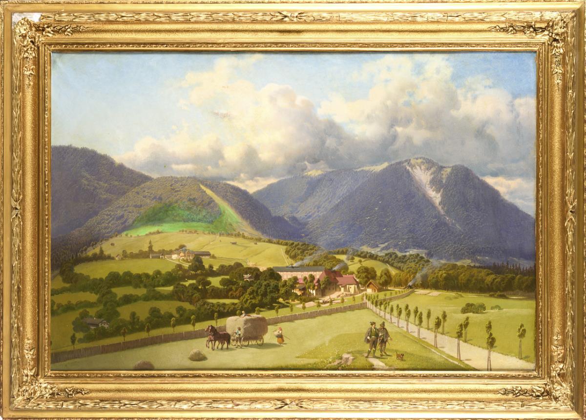 Landscape veduta with staffage figures not far from a village in front of the wooded mountains further back. A restored spot with backing, retouched.