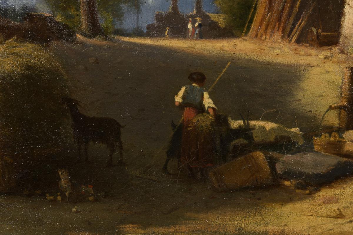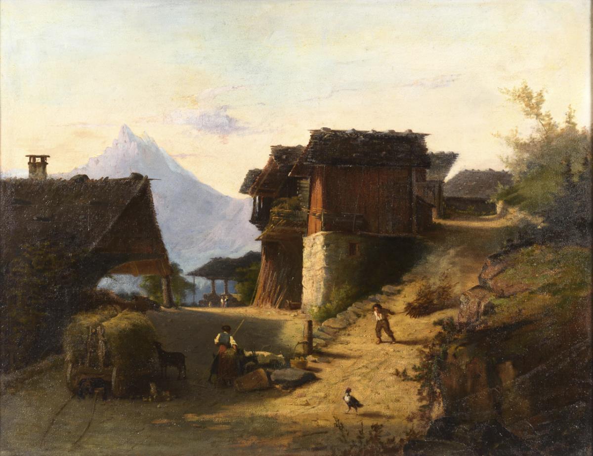Village street with peasantry and cattle in the sunshine. Traces of age.