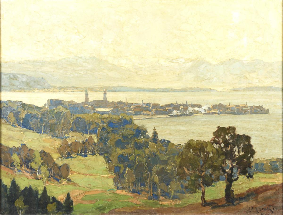 View over the trees to the city at the water in the atmospheric haze.