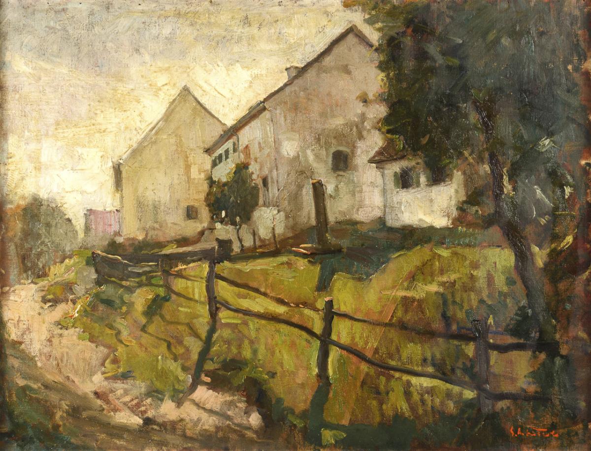 Narrow path along the fenced gardens with the houses in the sunshine.
