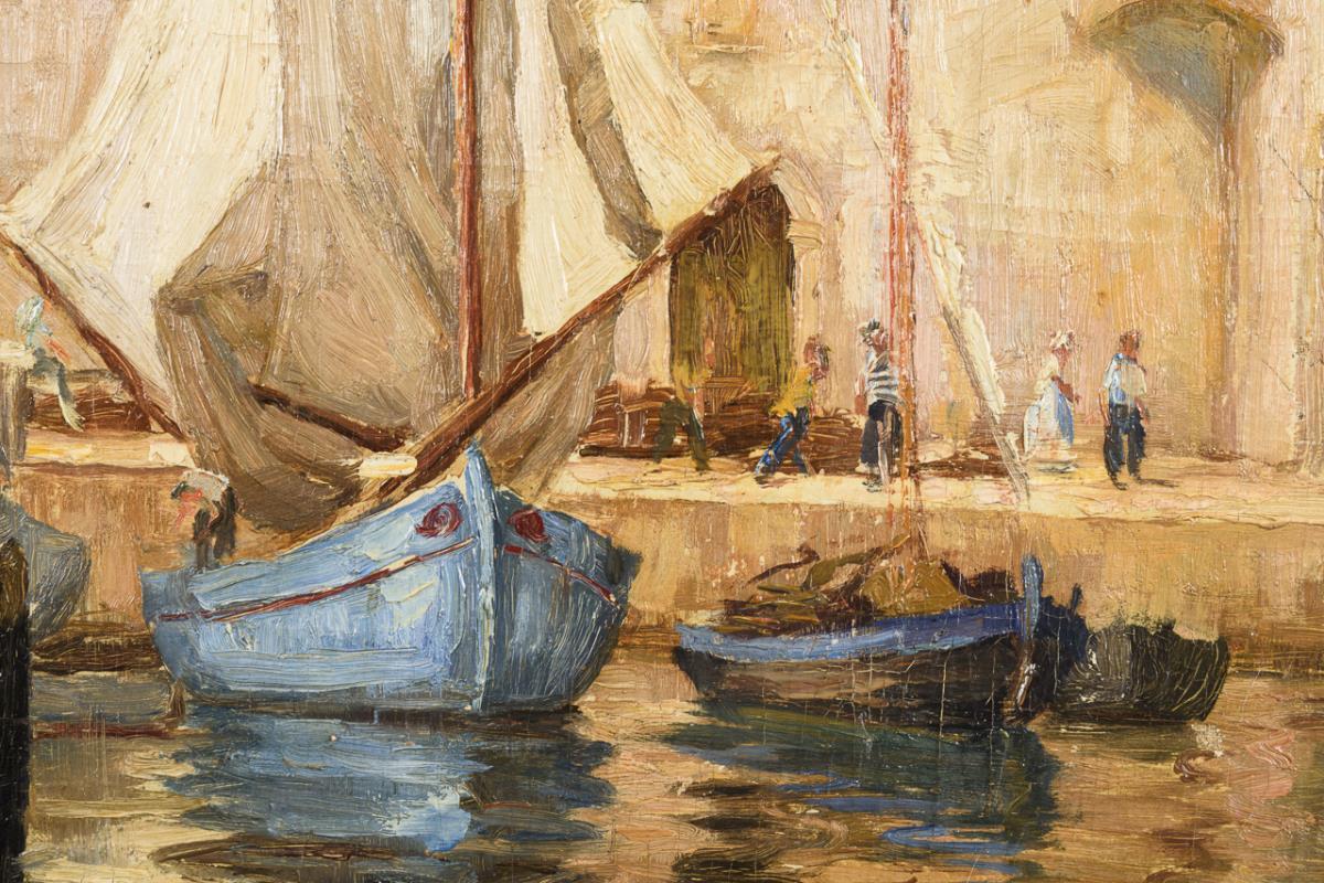 The little sailors in the sunshine at the quay before the closely standing town houses. Traces of age.