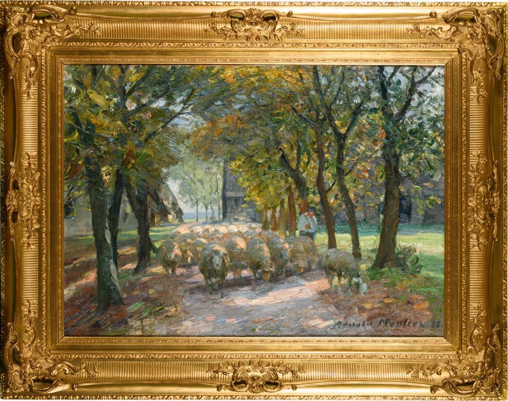 Der Hirte mit den Schafen auf einer schmalen Allee im Licht der warmen Sonne.
