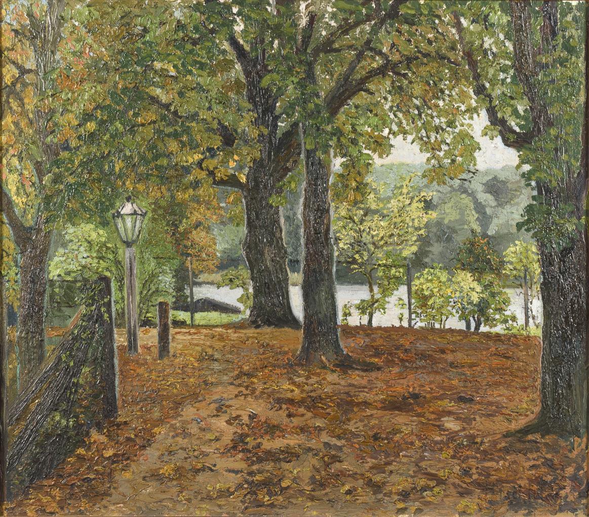 Autumn mood with brown foliage below the trees above the water.