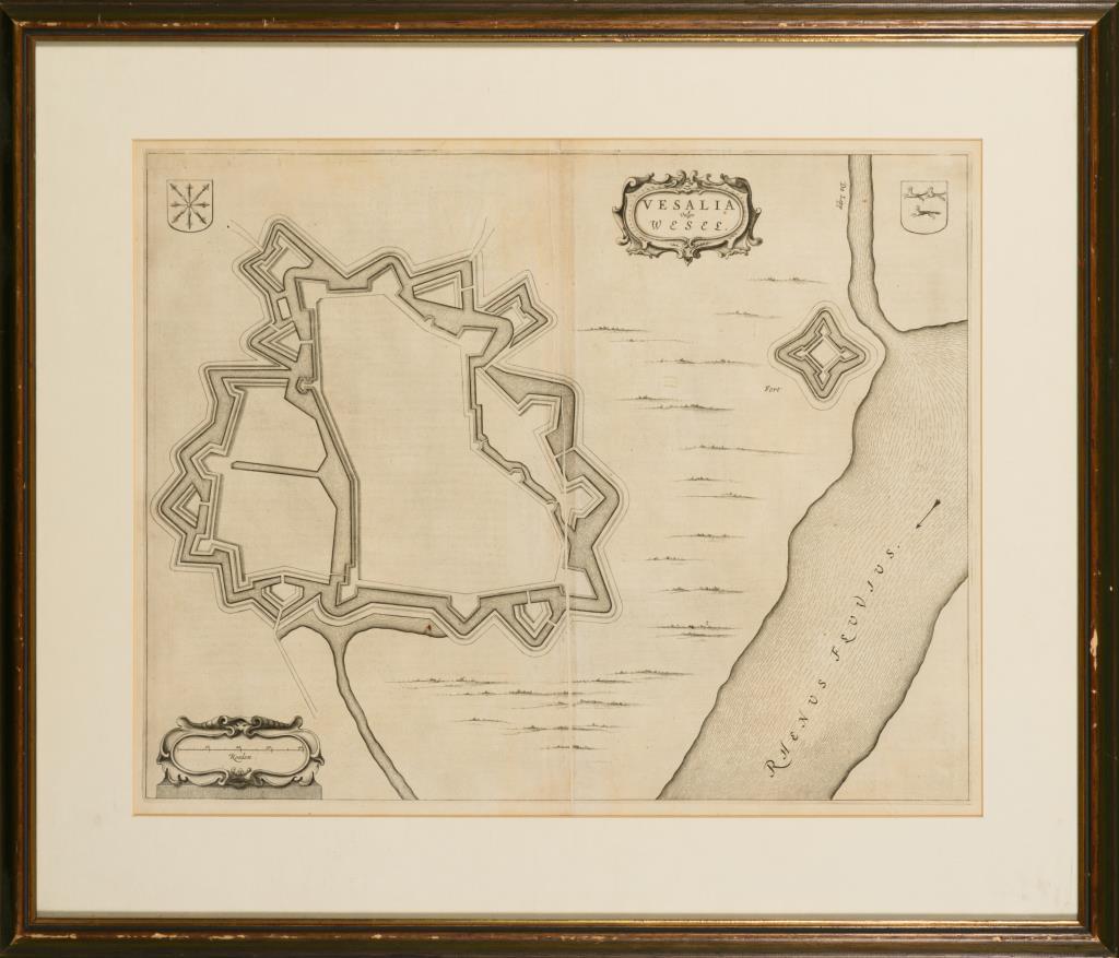 2-seitig verglastes Blatt mit Umriss der Hansestadt Wesel aus der Vogelperspektive, bezeichnet "Vesalia vulgo Wesel", verso Beschreibung in Latein, aus "Novus Atlas, Das ist Weltbeschreibung / mit schönen newen außführlichen Land-Taffeln in Kupffer gestochen und an den Tag gegeben durch Guil".