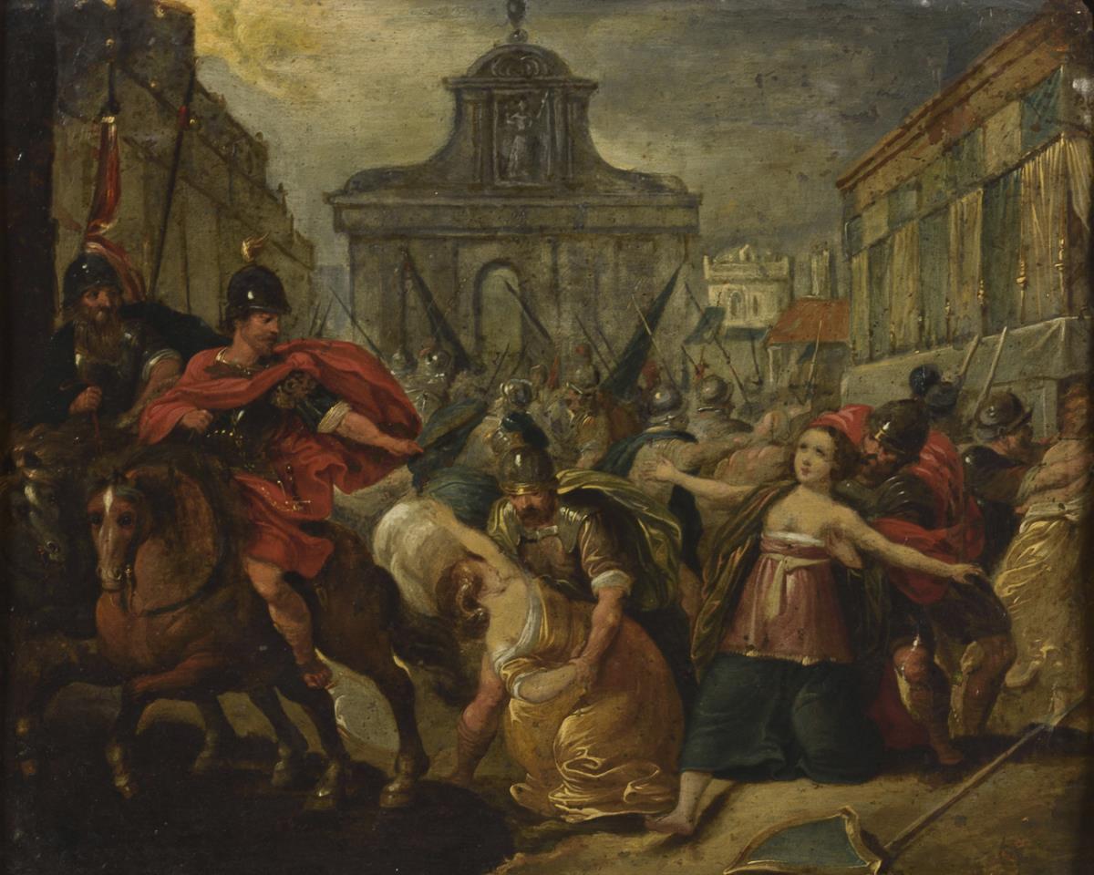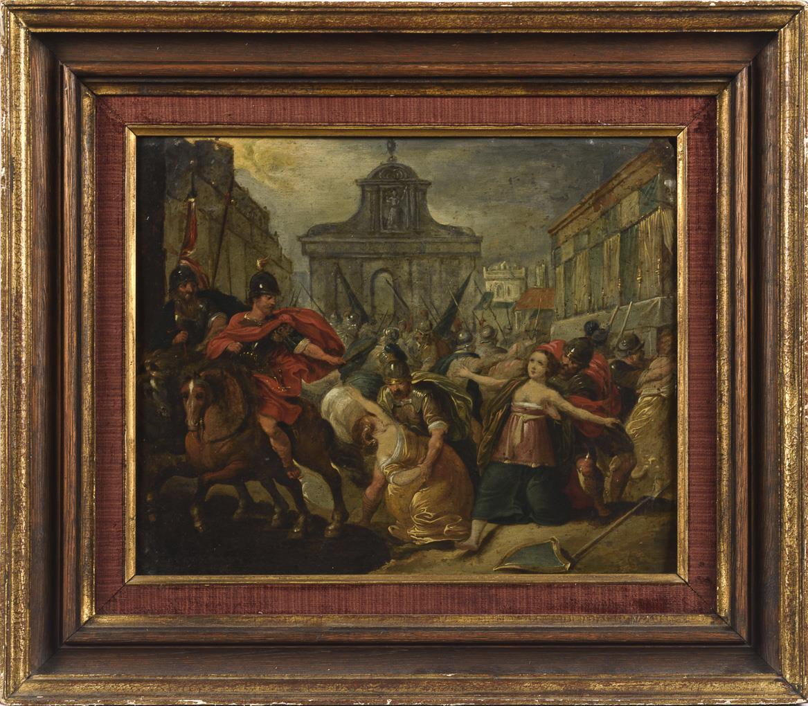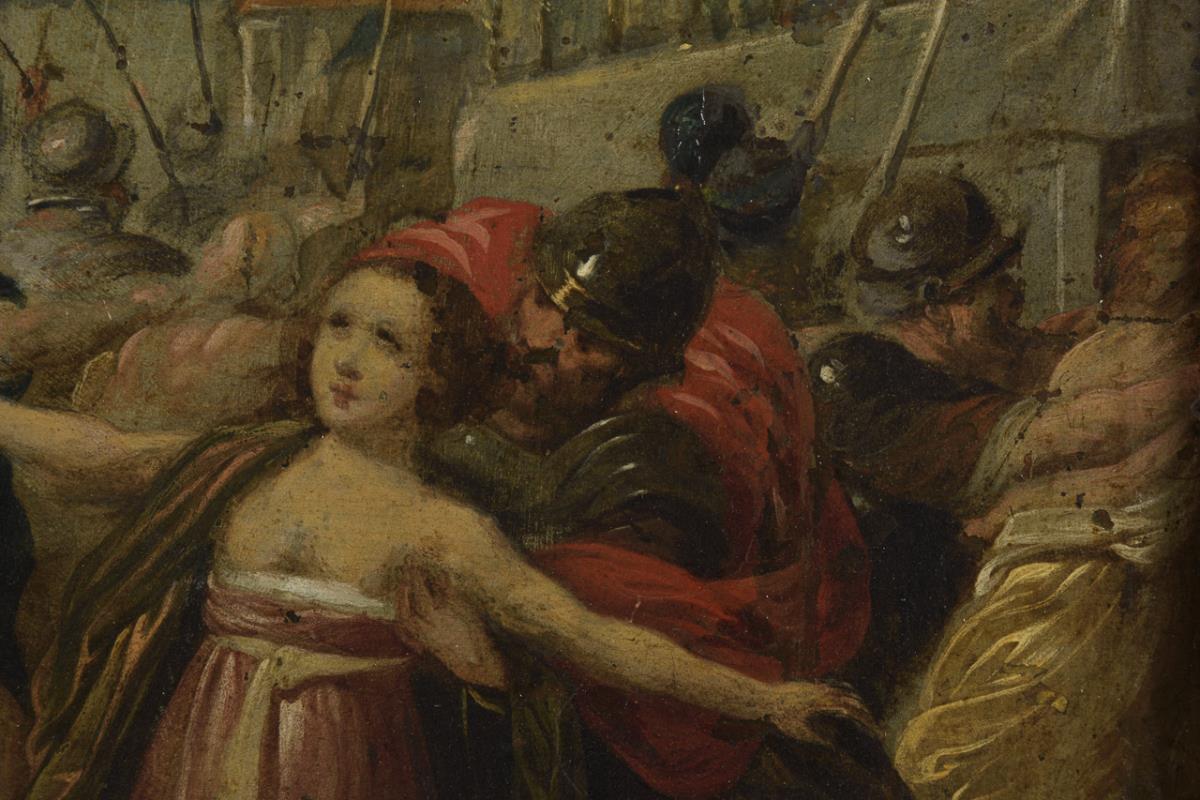 Small-format depiction of the popular mythological theme with the men led by Romulus seizing the women at the feast. Traces of age, slight paint chipping.