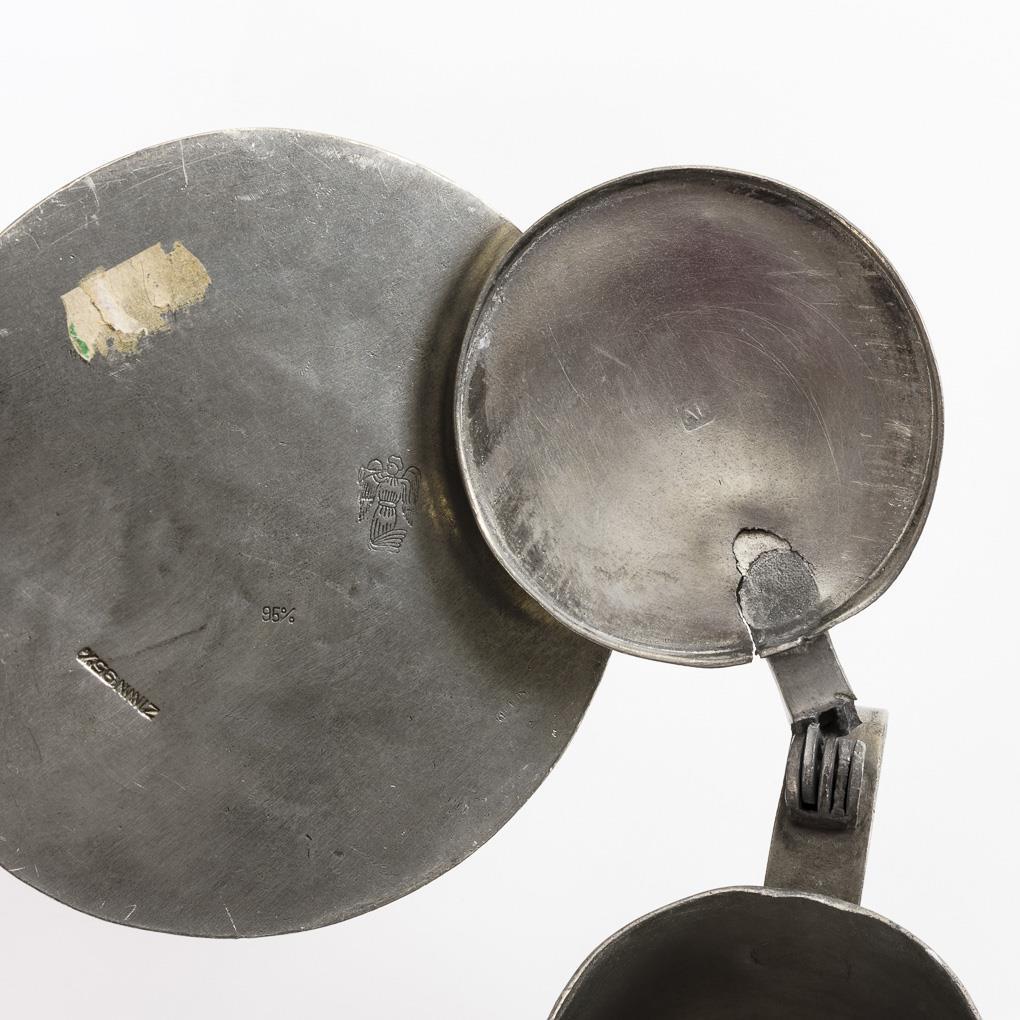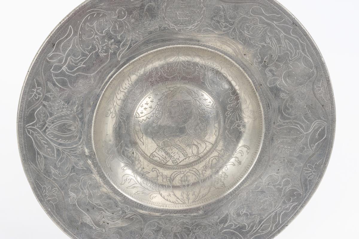Overly richly engraved bowl with a portrait in the centre. On the banner flowers with unicorn, griffin, lion and bull and name cartouche with date "1669". / 3 jugs; 1x with foliate frieze, 1x with monogram engraving "F". 2 jugs with defects and solder repairs. Each signs of age / use.