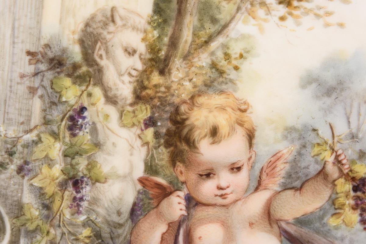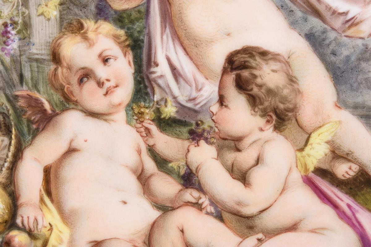 In the mirror the depiction of three putti reclining in an idyllic park landscape with fruit basket, surrounded by a rocaille wreath and a créme-coloured scale border.