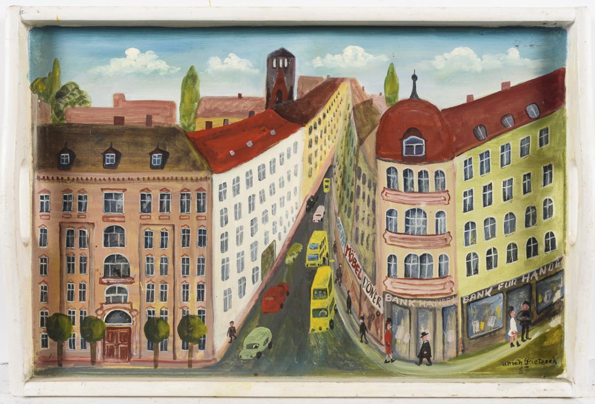 Serving tray with painted bottom showing a naively painted street scene with buses, cars and passers-by in front of the houses.