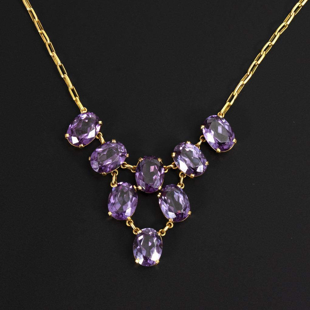 On pierced architraves fine, claw-set tanzanite between anchor chain with lobster clasp. 1 claw missing.