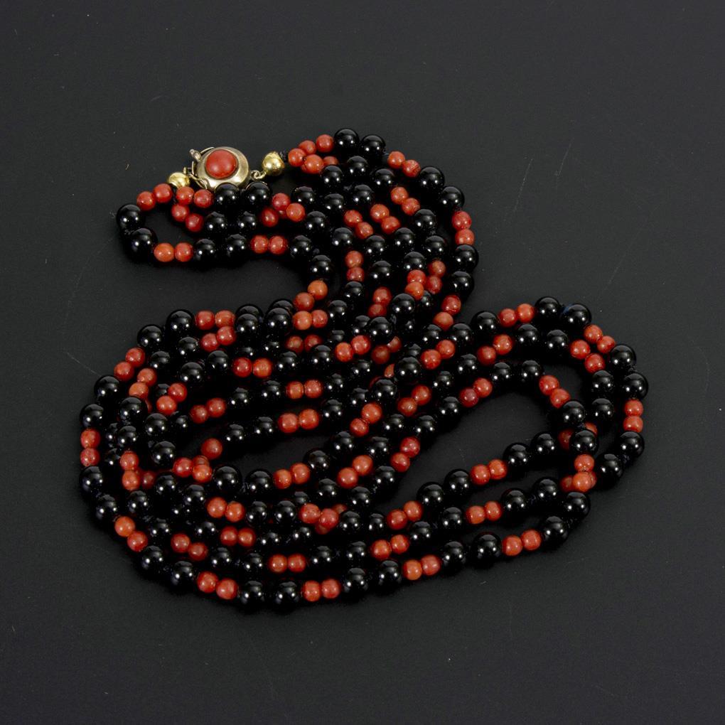 Lacing chains with onyx beads and small coral beads, on box lock with eight-lock.