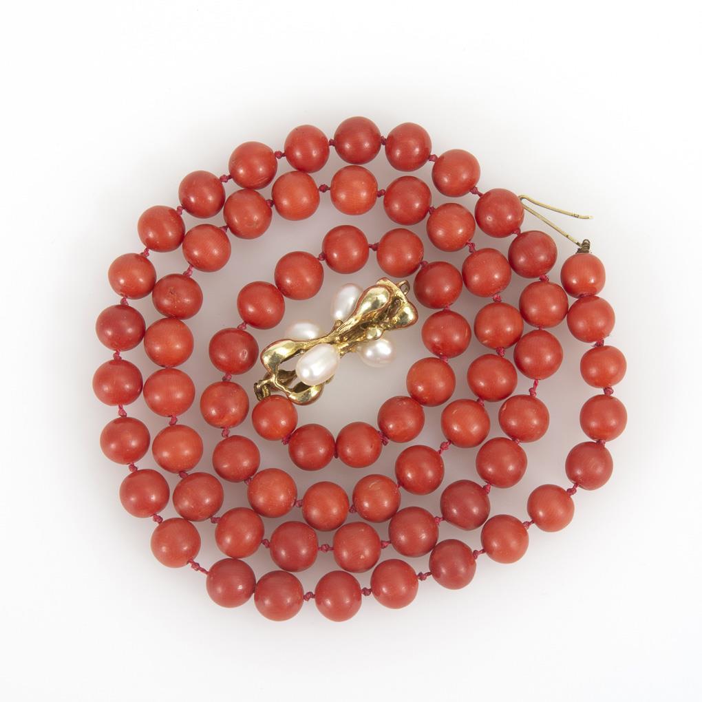 Stamped yellow gold 585. L 56,5 cm. Coral Ø 0.6 cm. 35,4 g.