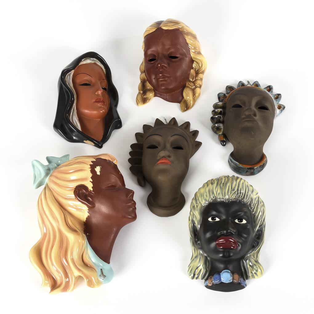 2x Karlsruhe Majolica: dark-skinned women. 1x Goldscheider West-Germany: woman with headscarf, 1953 to 1960. 3x Cortendorf: blond girls and dark-skinned woman. 1 mask with color flaws.