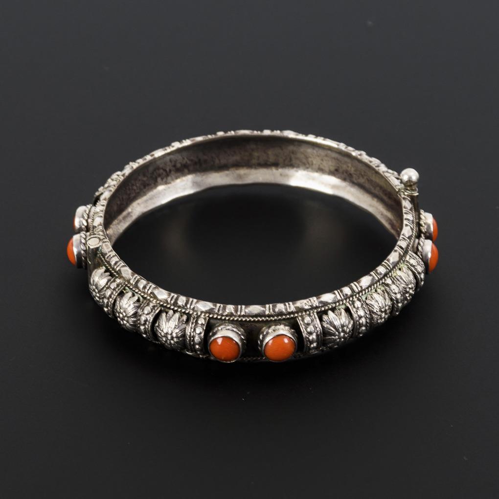 Round hinged bangle with relief decoration and small coral cabochons. Pin clasp.
