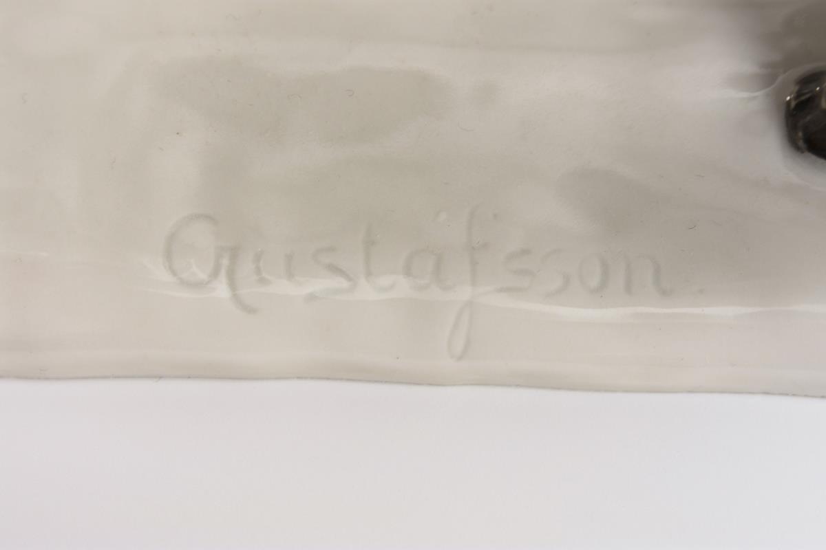 1x marked Katzhütte: art deco sculpture of a girl standing in front of a greyhound (h 12 cm). / 1x marked Goebel, inscribed "Gustafsson": sculpture of a faun bumping horns with a billy goat (h 11 cm).
