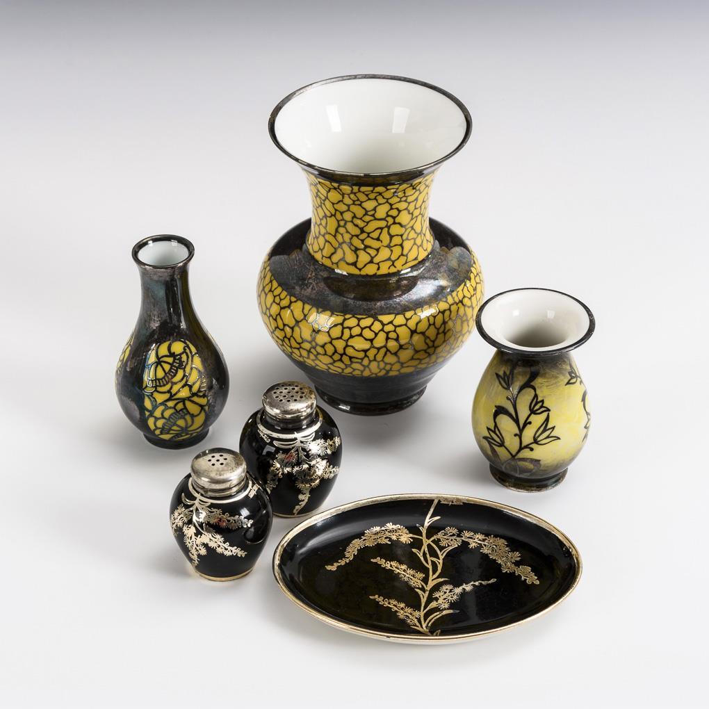 Silver overlay on black and yellow resp. yellow-black marbled ground. Crater vase (h 13,5 cm), 2 pear vases (h 8 and 9,5 cm), 2 spice shakers (h 5 cm) and 1 small oval tray (l 12 cm).