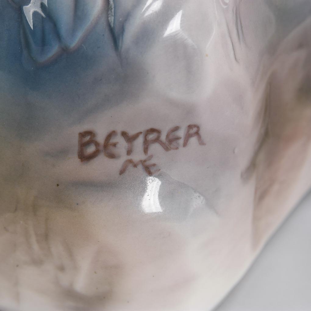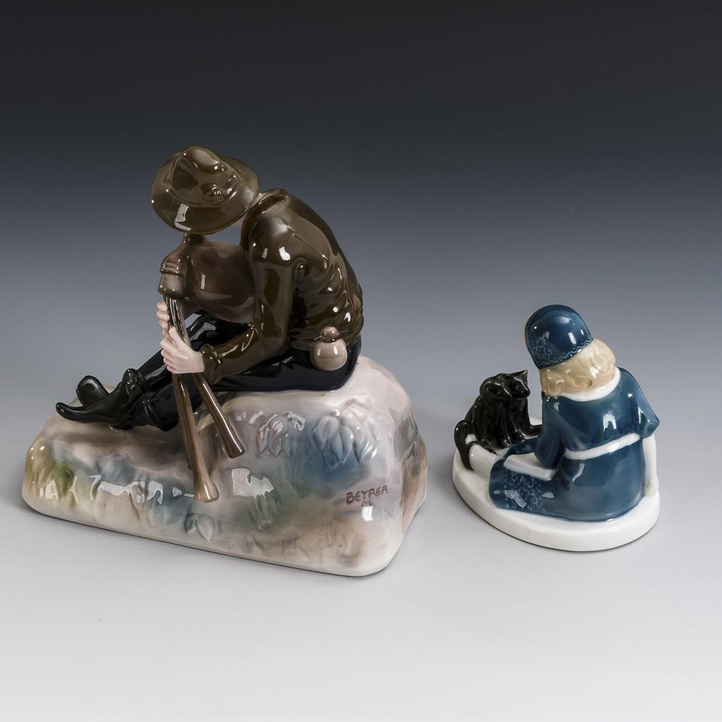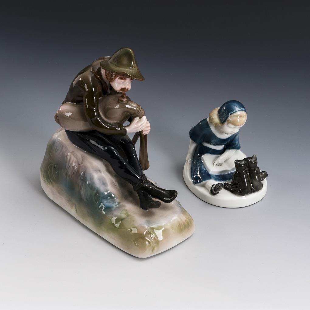 1x design by Michael Emmanuel Beyrer (1879-1948): shepherd seated on a grass pedestal playing a bagpipe (h 17,5 cm). / 1x design by Albert Caasmann (1886-1968): girl sitting in front of two teddy bears with an open book (h 9.5 cm).
