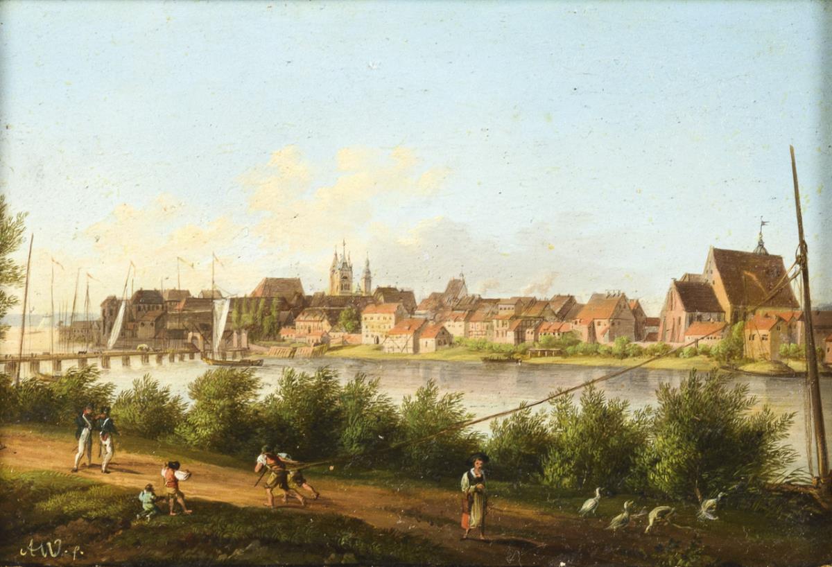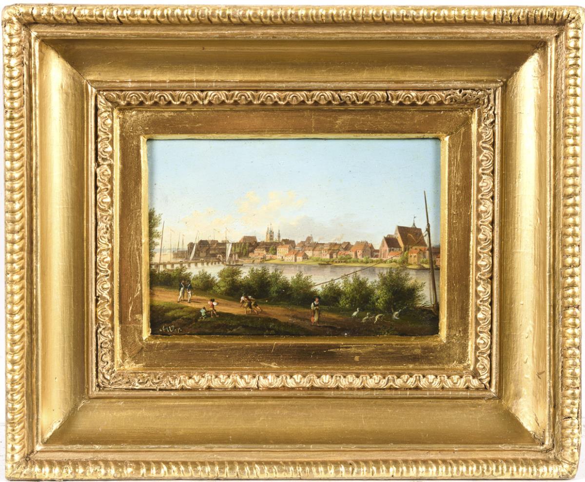 Staffage figures near the river bank with view to the detailed painted town in the sunshine under blue sky. Traces of age.